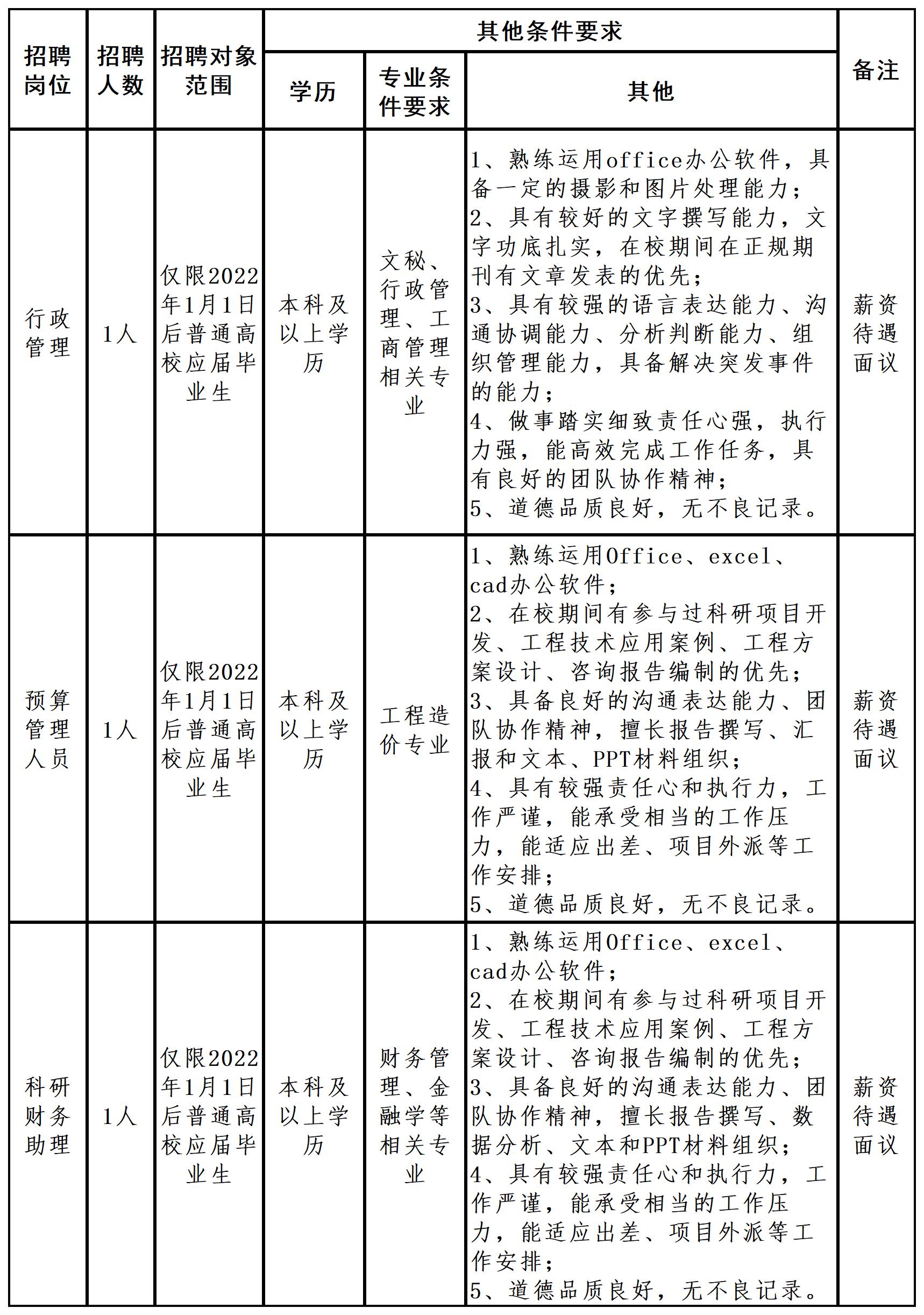 | 注冊二級造價(jià)師 | 1 | 面向社會(huì)公開招聘 | 普通高校本科及以上學(xué)歷 | 工程造價(jià)相關(guān)專業(yè) | 1、熟練使用廣聯(lián)達(dá),斯維爾,宏業(yè)算量計(jì)價(jià)軟件; 2、具有乙級及以上設(shè)計(jì)單位工作經(jīng)驗(yàn),主持或參與過給水、排水工程2項(xiàng)及以上設(shè)計(jì)工作業(yè)績; 3、有評獎(jiǎng)評優(yōu)經(jīng)歷或參與過科技廳、環(huán)保廳等科研項(xiàng)目經(jīng)驗(yàn)的優(yōu)先; 4、思想政治素質(zhì)和職業(yè)操守好,遵紀(jì)守法、誠實(shí)守信,無不良記錄; 5、中共黨員優(yōu)先。 | 待遇面議 |