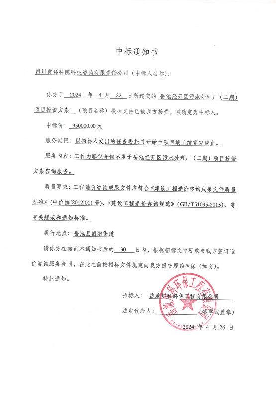 岳池經(jīng)開區(qū)污水處理廠(二期)項目投資方案服務—中標通知書